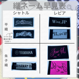 その織りネームには更に、糸の織り方によって様々な表情を持ちます。一般的な織り方は以下の2つ